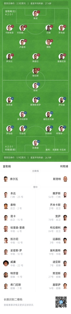 富勒姆替补:23-本达、2-泰特、15-昆卡、6-哈里森-里德、10-凯尔尼、32-史密斯-罗、11-阿达玛-特劳雷、7-劳尔-希门尼斯、22-威廉